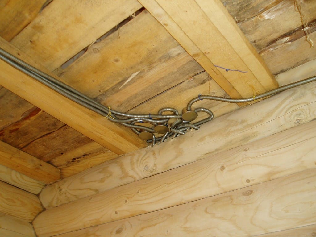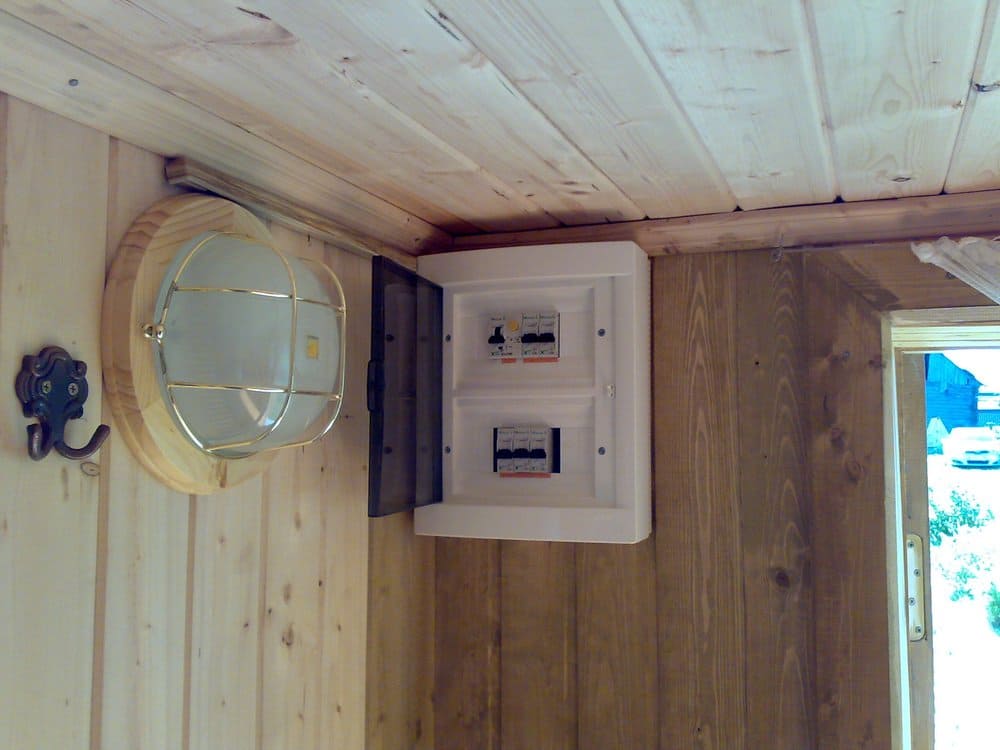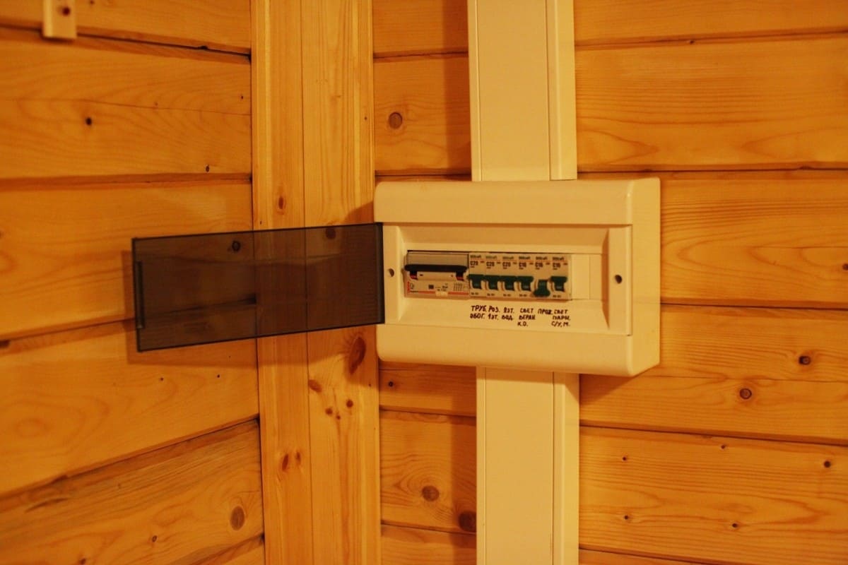 Установка электрики в бане осуществляется только открытым способом. Чтобы улучшить эстетический вид и предотвратить возгорание в случае повреждения изоляции, мы монтируем все кабели в пластиковой гофре. Кроме того, наши мастера, следуя технике безопасности: