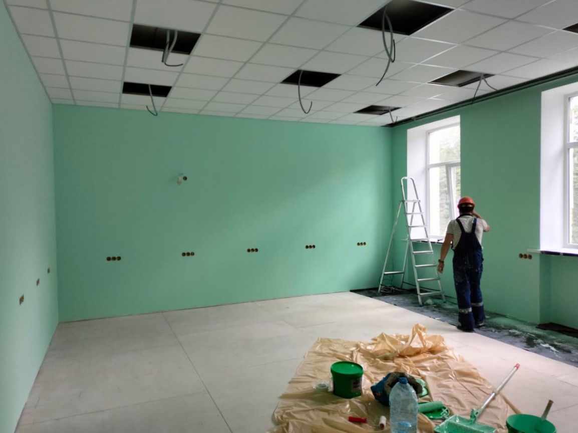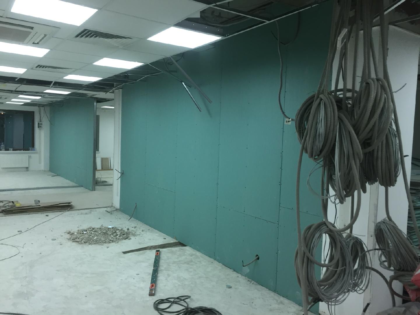 в данном проекте офис Open Space, в связи с этим прокладка кабельных линий и монтаж электрики в офисе производилась с потолка на закрепленной растяжке. К каркасу столов был прикреплен кабель канал с разделительной стенкой (отделение слаботочной и силовой линии), напротив каждого рабочего места делался вывод интернета и монтировался блок розеток